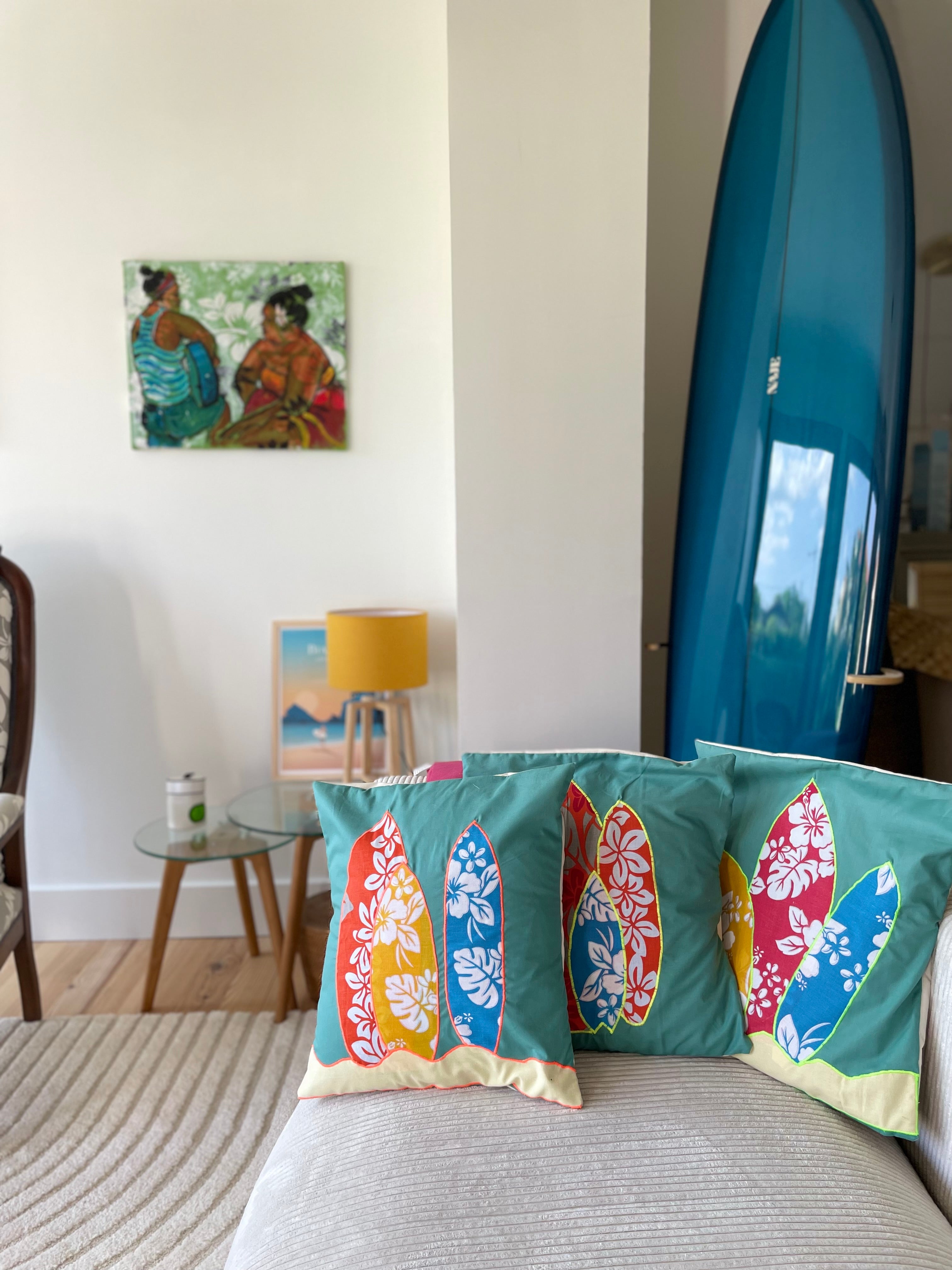 La collection "De Teahupo'o à Belharra" célèbre le lien entre la Polynésie et la Côte Basque à travers l’univers du surf. De la puissance mythique de la vague de Teahupo'o aux lignes majestueuses de Belharra, c’est la mer qui unit ces deux territoires entre grands horizons et passion du surf. Nos housses de coussins vous invitent à vibrer avec cette énergie libre et salée.