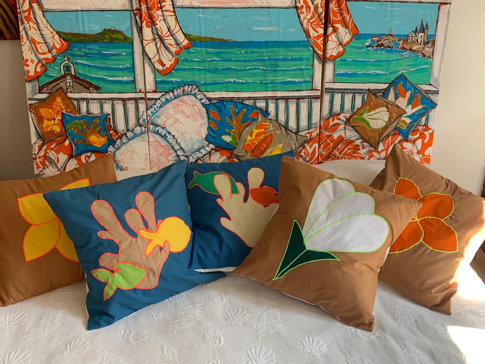 Découvrez notre collection de housses pour coussins à travers trois thématiques : "Fleurs des îles", "Jardin de Corail" et "De Teahupo'o à Belharra".